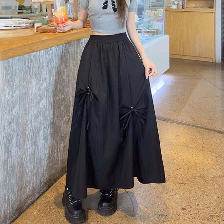 揺れるたび、さりげなく可愛いリボンアクセントギャザーロングスカート