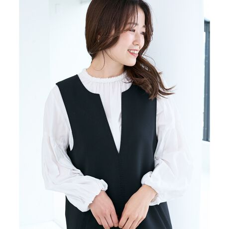 タックを施したボリュームスリーブが印象的な、シャツ地ブラウスです。