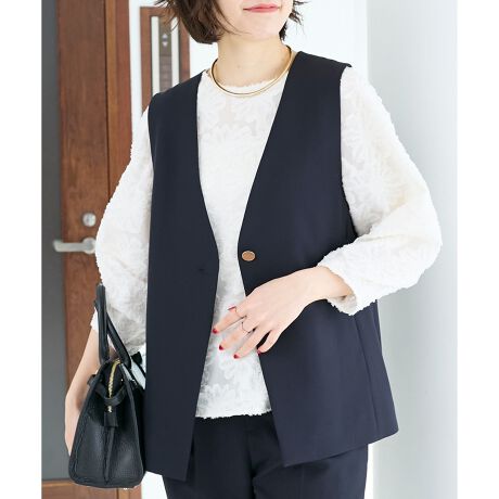 さりげないバックフリルがアクセントになった、華やかさと着回し力を兼ね備えたジレ。