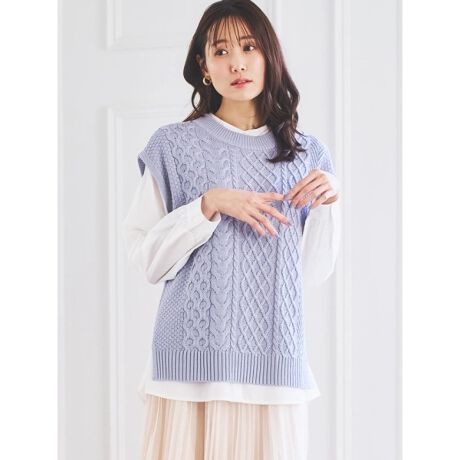 ケーブル編みのニットベストとシャツを組み合わせたセットアイテム。