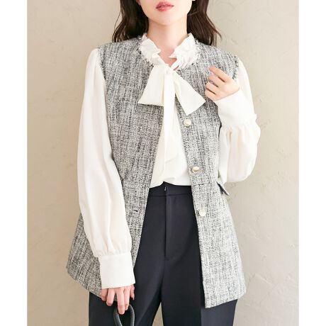 上品なツイード素材に、ふんわりとしたフリンジディテールを施した華やかなジレ。