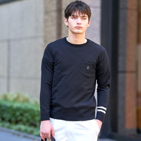 袖口には配色ライン、ポケットにはブランドのイニシャル刺繍を施し、さりげない個性をプラスしています。