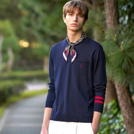 袖口には配色ライン、ポケットにはブランドのイニシャル刺繍を施し、さりげない個性をプラスしています。