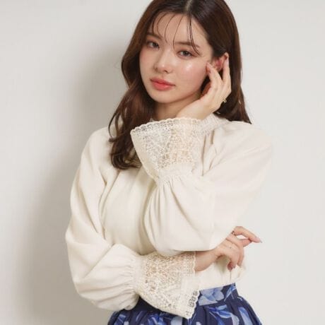 袖口に繊細オリジナルレースのキャンディーカフスをあしらった、シャーリングネックブラウス。