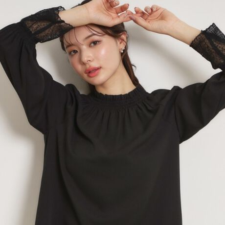 袖口に繊細オリジナルレースのキャンディーカフスをあしらった、シャーリングネックブラウス。