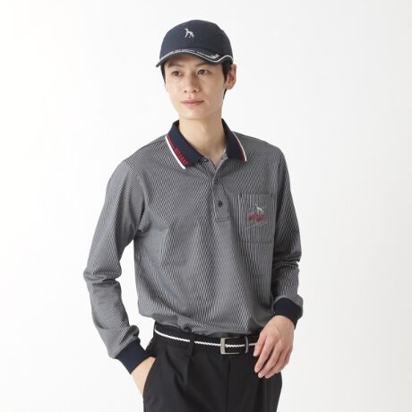 洗練されたファインストライプ柄を巧みに用いた長袖ポロシャツは、ビジネスシーンからカジュアルな日常まで幅広く活躍します。