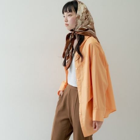 左右の大きめポケットが印象的なシャツは、タックにより生まれるフォルムが特徴的で、シンプルながらも洗練された印象を与えます。