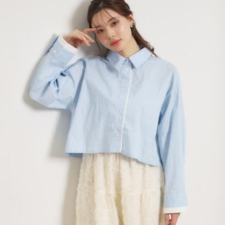 春らしいストライプ素材のショート丈のシャツ。