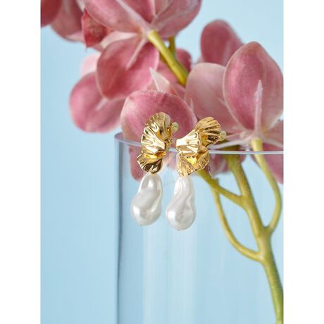 <b>【メタルにバロックパール調のパーツを合わせた、アート感あるイヤリング。さまざまなスタイリングのアクセントに】</b>