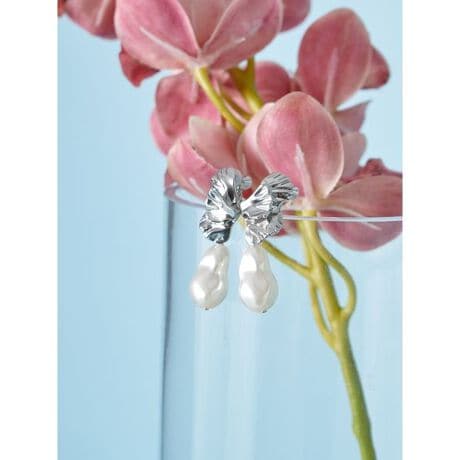 メタルモチーフと、変形パールの組み合わせがアクセントになるイヤリングです。