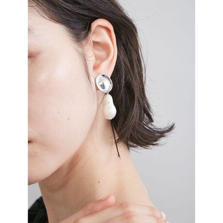 メタルモチーフと、変形パールの組み合わせがアクセントになるイヤリングです。