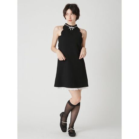 首元で揺れるリボンビジューが華やかなアクセントになるミニワンピース。見頃と同じ生地で施したスカラップをアメリカンスリーブデザインに落とし込み、上品で女性らしいムードを引き立てます。ほどよく体から離れるAラインシルエットが、スタイルを美しく見せてくれるのも魅力。裾はシフォンプリーツ素材と裏地をドッキングし、軽やかなレイヤード風デザインに仕上げました。1枚で主役になる特別感のあるアイテムです。
