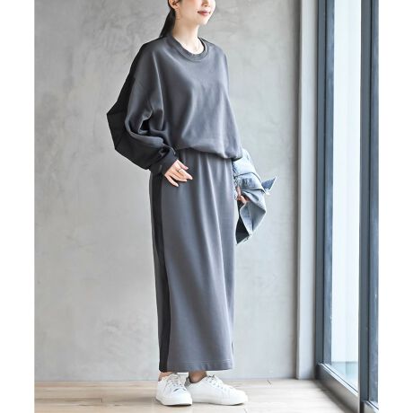 トップスとスカートのカジュアルなスウェットのセットアップ。