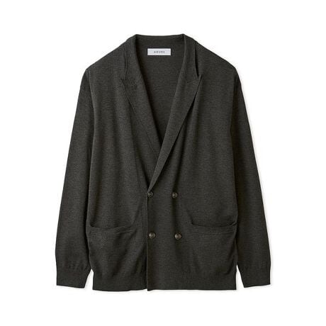 カーディガン感覚で着れるニットのダブルジャケット。ニットがもつカジュアルな印象は残しながら、ジャケット見えになるように編みテクニックを工夫しました。ラペル見返しにはぎを入れない編み続きにテクニックやラペルを成形で表現することで