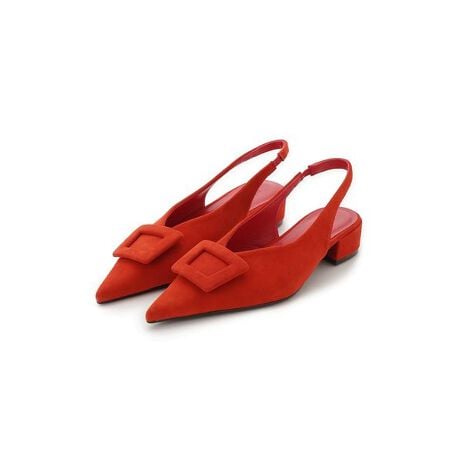 スリングバックのスタイルで、華奢なバックストラップが女性らしさを引き出してくれます。また、ストラップはゴムがついているので、脱ぎ履きも楽。