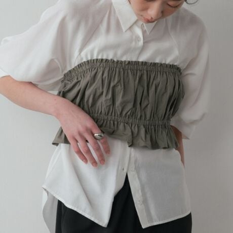 シャーリングがバストラインを美しく見せつつ、フリルがモードな遊び心をプラス。