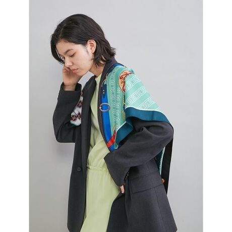 ベルトとチェーンをモチーフにした、エレガントな大判のスカーフです。