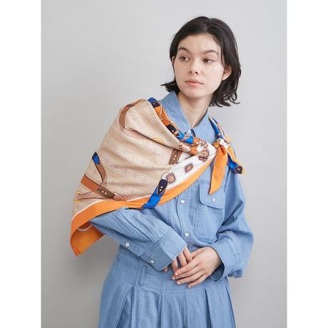 ベルトとチェーンをモチーフにした、エレガントな大判のスカーフです。