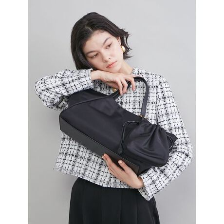 ナイロンのツヤがあって高級感のある素材を活かして、モードな印象のアイテムに。