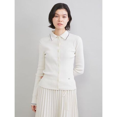 襟元と袖口に入った配色のラインがスタイリッシュな、ポロ襟つきのニットカーディガンです。