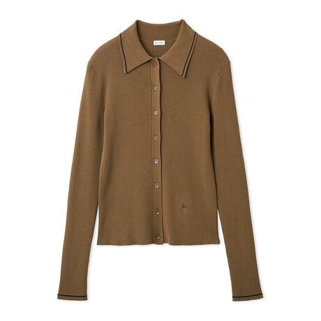 襟元と袖口に入った配色のラインがスタイリッシュな、ポロ襟つきのニットカーディガンです。