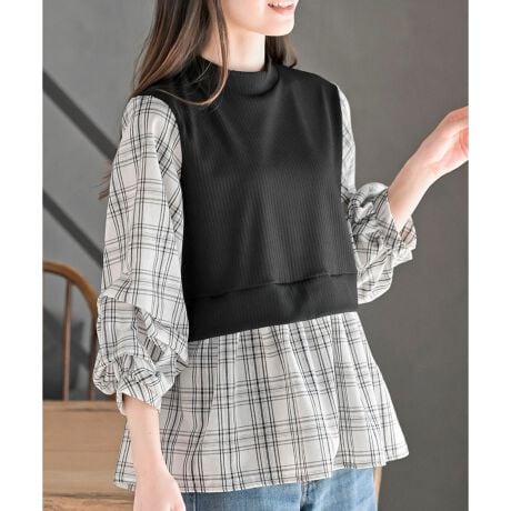 変形タックスリーブ衿付きドッキングブラウス