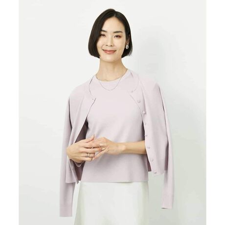 同素材のプルオーバー【F6FDD01190】と合わせたアンサンブルスタイルがおすすめです。きちんと感を保ちながら、上品できれいめな着こなしにまとまります。また、単品使いでプルオーバー風に着こなすのもおすすめ。ロンTやTシャツの上から軽く羽織り、カラースカートやデニムと合わせれば、カジュアルなスタイリングにもフィットします。