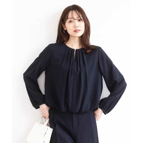 胸元のタックデザインとメタルパーツがお顔周りに華やかさをプラスしてくれるブラウス。身頃は裏地付きなので、透けの心配もありません。裾は裏地と一体になったバルーンシルエットでボトムにインしなくても自然と決まるのが嬉しいポイントです。
