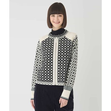 袋ジャカードとインターシャで表現したハイスペックなディテールが魅力的な一枚。大胆な幾何学模様とストライプやボーダーの細い線を合わせたデザイン性の高いひと品です。コンパクトなフォルムで着回しやすく、フロントジップ仕様でカジュアルにも好相性。様々なボトムと相性良く、スタイリングのポイントに最適なおすすめのアイテムです。同素材を使用したプルオーバー【R6FCE81330】もおすすめ。