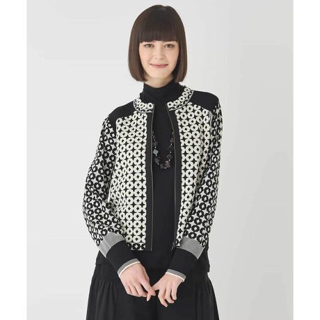 袋ジャカードとインターシャで表現したハイスペックなディテールが魅力的な一枚。大胆な幾何学模様とストライプやボーダーの細い線を合わせたデザイン性の高いひと品です。コンパクトなフォルムで着回しやすく、フロントジップ仕様でカジュアルにも好相性。様々なボトムと相性良く、スタイリングのポイントに最適なおすすめのアイテムです。同素材を使用したプルオーバー【R6FCE81330】もおすすめ。