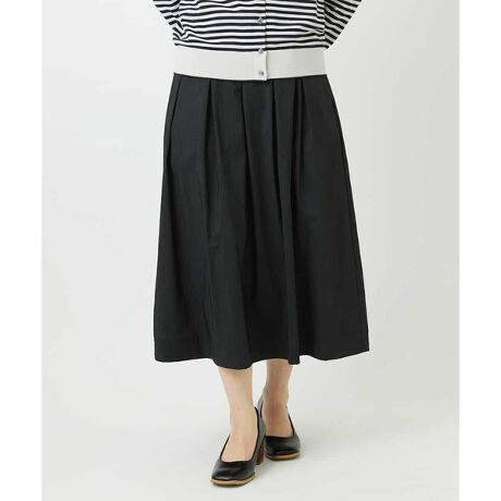 素材ならではの滑らかな光沢とハリを活かし作り上げた、ほどよいボリューム感のタックギャザースカートです。ウエストの前脇から後身頃がゴム仕様でストレスフリーな穿き心地。穿き込み着用のお仕立てです。ヒップ辺りまでタックをたたみ膨らみ過ぎない様に工夫をしております。両脇にはスラッシュポケットが付いています。無地見えするストライプでシンプルデザインなので、コーデしやすくカジュアルにもきれいめスタイルにも、シーズン長く楽しめるアイテムです。