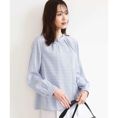 小さな幾何柄がオフィスシーンにもぴったりなブラウス。襟はネック程よく沿うバンドカラーで、アウターにも合わせやすいところがポイント。