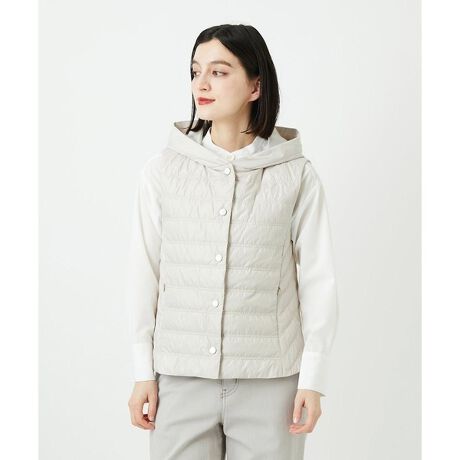 控え目なブライト感が上品な薄ダウンベストは春コートのライナーとしても使える一着です。防寒はもちろん、着膨れしないサイジングや斜めに入れた脇のステッチですっきりと細見えを叶えてくれます。室内で軽く羽織るのにも便利です。両サイドには切替利用の小さめコンシールファスナーポケットを施しています。フードはボリューム感がおさえられた、かぶれるサイズとなっています。
