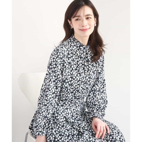 小花柄のプリントはコーデに馴染み大人可愛い雰囲気に。同素材のスカートもご用意しているので、セットアップでワンピース風の着こなしもおすすめです。