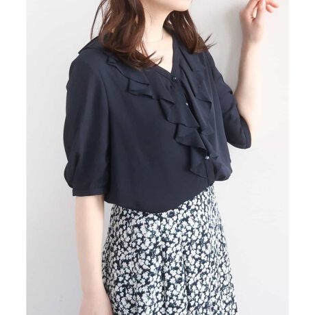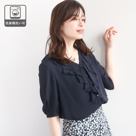 衿ぐりと前立てにあしらわれたフリルがデザインポイントのブラウス。上品なVネックが女性らしくデコルテをきれいに見せてくれます。脱ぎ着のしやすい前釦デザインも嬉しいポイント。
