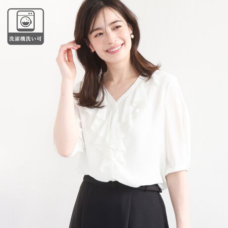 衿ぐりと前立てにあしらわれたフリルがデザインポイントのブラウス。上品なVネックが女性らしくデコルテをきれいに見せてくれます。脱ぎ着のしやすい前釦デザインも嬉しいポイント。