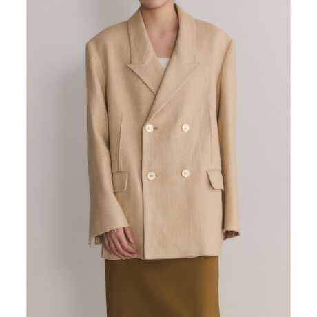 ややオーバーサイズなピークドラペルのダブルジャケット。