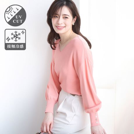 ハイゲージのきれいな目面が特徴のニット素材。型崩れしにくく伸縮性抜群の総針編地です。お仕事などにもちょうどいい見え感でさらりとした肌触りの良さがポイント。接触冷感、UVカット機能付き。