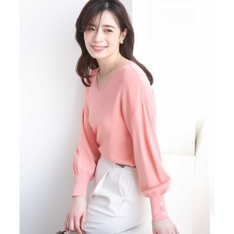 定番のVネックニットは程よいネックの開き具合がレディライクに。すっきり見えながらもボディラインを拾わないサイズ感とシルエットが自慢のニットです。