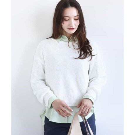 きれいめな目面のニットはコットン混でさらりとした着心地。程よい肉感もありシーズンレスで着こなしやすい素材感です。