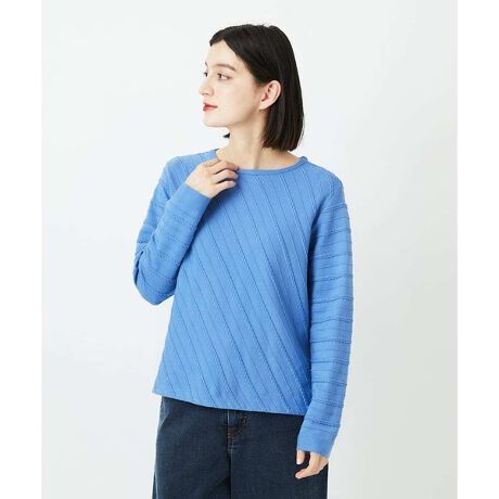 小さなケーブル風のタック編み柄がポイントの大人可愛いニットです。ピンタックとケーブル風タック柄をボーダーに編み込み、前身は編地をバイヤス使いに仕上げました。季節を先取りできる春らしいカラーの3色展開です。すっきりとした着丈でスタイルアップが叶い、ほどよくゆったりシルエットがこなれ感をプラスしてくれます。