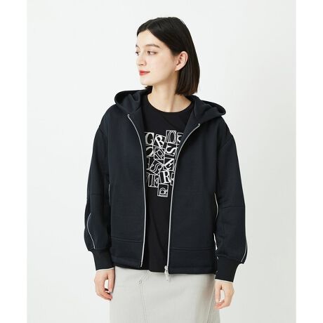 光沢感のあるブライトジャージで作った配色ライン入りパーカーです。ポケット口と袖口は編立リブを使用し、配色ラインと同色に仕立てています。適度なツヤのある見た目で、パーカーほどカジュアルになりすぎず様々なアイテムに合わせていただけます。ややコンパクトな着丈で、ボトムスを選ばず着まわせます。