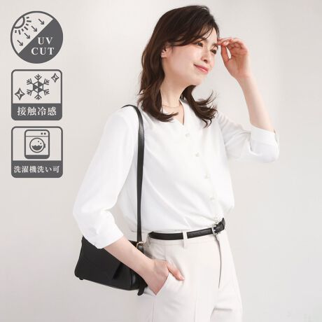 上品かつしなやかで透けにくくシワになりにくい素材です。接触冷感、UVカット機能付き。