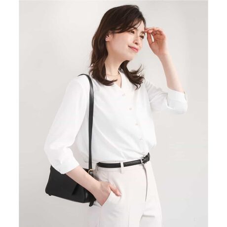 デコルテをきれいに見せてくれる程よいVネック加減のブラウス。ゴールドのスクエア型釦がポイントに。前の開くデザインは脱ぎ着のしやすさも嬉しい。今季より、衿ぐり上端が捲れにくいようにアップデートし、より着こなしやすいデザインに。