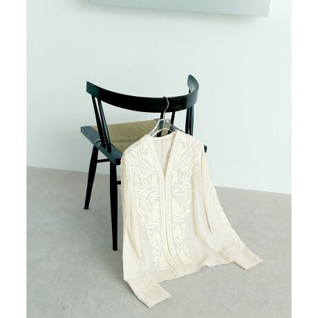シアー素材に、コットンのテープを波打つ様にはわせた刺繍と、抽象的なパーツをステッチワークで叩きつけたクラフト感のある唯一無二なデザイン。