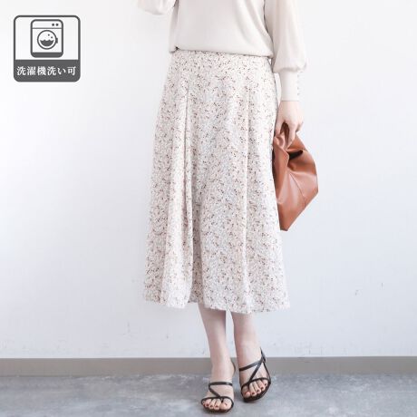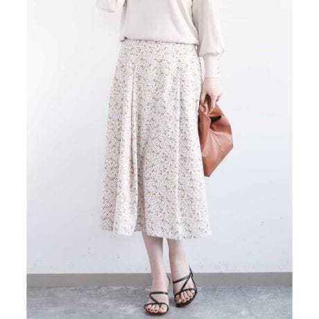 小花柄のプリントはコーデに馴染み大人可愛い雰囲気に。同素材のブラウスもご用意しているので、セットアップでワンピース風の着こなしもおすすめです。