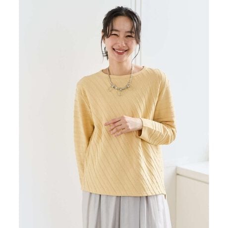 ・ピンタックとケーブル風タック柄をボーダーに編み込み、前身は編地をバイヤス使いに仕上げました。