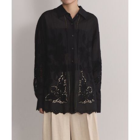 メンズライクなサイズ感のシャツをベースに、こだわりのエンブロイダリーを贅沢に施しマニッシュとフェミニンのバランスが絶妙な1着。
