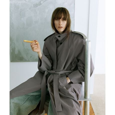 マニッシュなトレンチディティールを取り入れ、袖のカーブしたフォルムやたっぷりとした生地の分量感など、女性らしさも大切にしたスプリングコート。