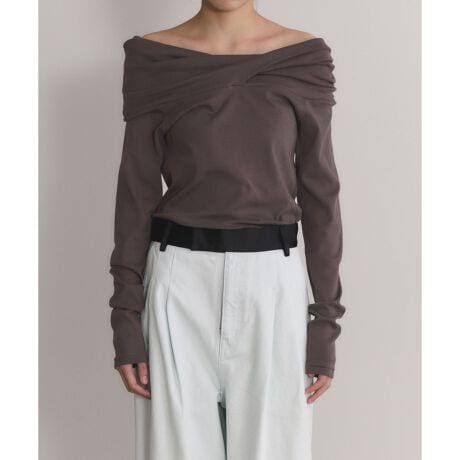 襟ぐりのツイスト生地で、肩を覆った着こなしや、オフショルとしても着用できる2WAYデザイン。